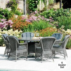 6 comfortable stylish open weave armchairs with charcoal grey cushions and a 150cm glass topped table make up the set and for added convenience the table includes a parasol hole and enough space underneath for a parasol base (sold separately) to conveniently sit without getting in the way of diners’ feet.