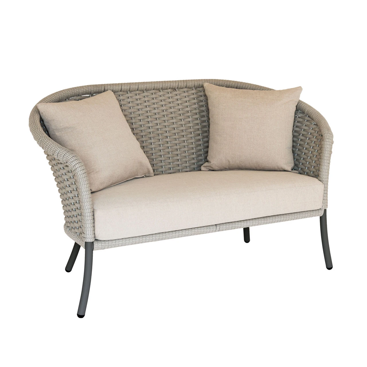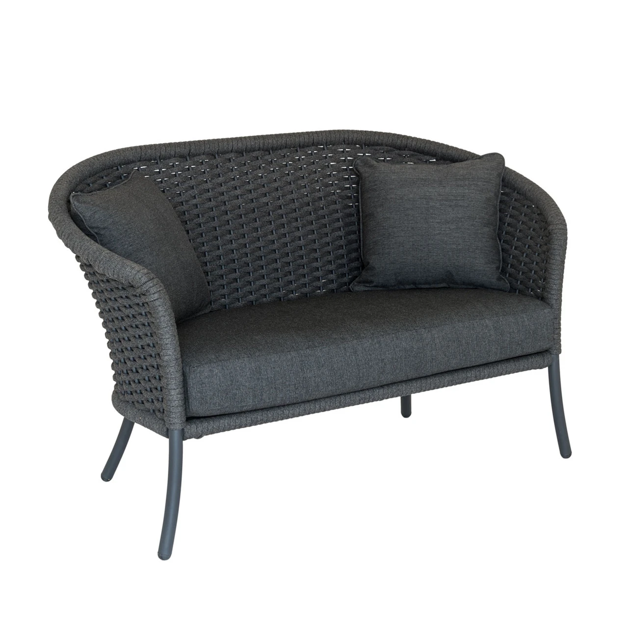Constructed from a lightweight aluminium tubular frame, the Cordial Curved Top Sofa is finished with a modern braided rope basket weave pattern.