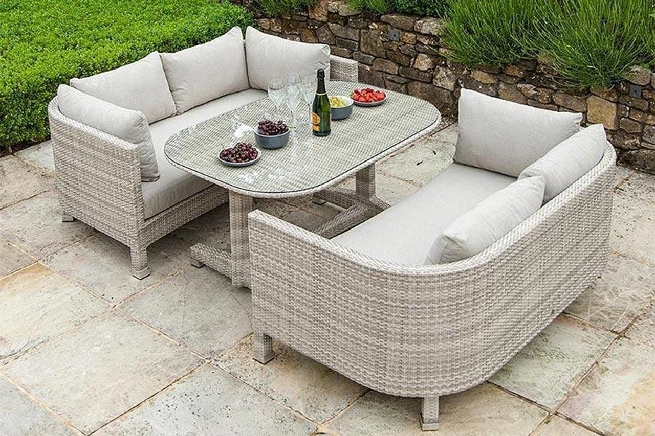 Suitable for both indoor and outdoor use and perfect for when space is limited the Alexander Rose Ocean Pearl Sunset Lounge Set comprises of 2 luxury curved sofas with cushions and an oval glass-topped dining table.