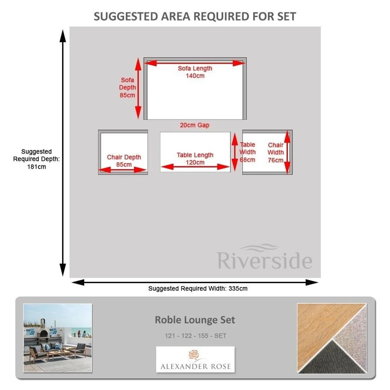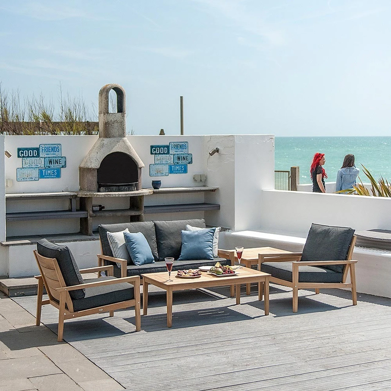 Suitable for both indoor and outdoor use the Alexander Rose Roble Lounge Seater Set is a beautiful, casual-looking smooth lustre set with Chunky Olefin cushions ideal for spending hours relaxing during those long sunny days. For added convenience the table includes a parasol hole and enough space underneath for a parasol base (sold separately) to conveniently sit without getting in the way of diners’ feet. The fold flat design makes it easy to set up and put away, ideal for space saving or moving around with ease. The set has a light yellow interlocked grain that turns grey over time, with a smooth lustre the table and chairs are easy to maintain.