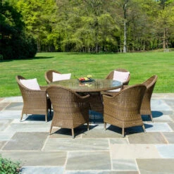 Consisting of 6 Round Top Armchairs With Oatmeal Cushions and one Round Table 1.5m, this fantastic set will turn any space into the ideal place for family to come together and spend some quality time.